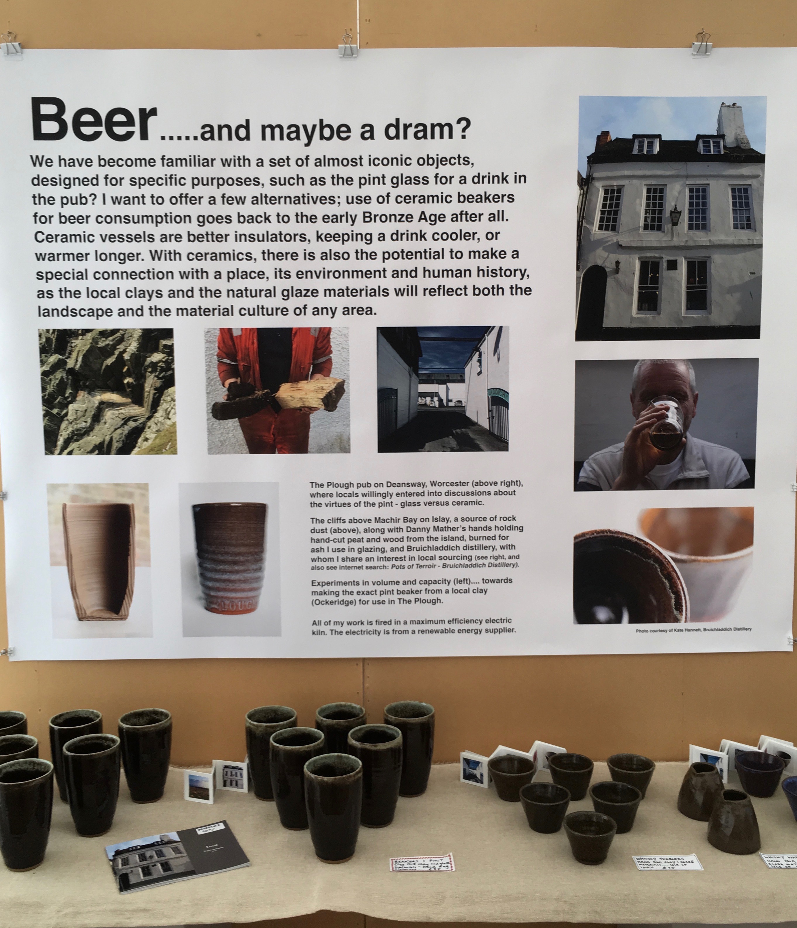 It is perhaps worth emphasising that owing to the nature of my work, i.e. exploring the links between clay, people and place, the associated projects, stalls, workshops and exhibitions are often linked to businesses in the areas close to my home city, or in the places that I am conducting research. Links with The Plough pub on Deansway, Worcester, Bruichladdich Distillery on the Isle of Islay, Triangle Bakehouse in Ripponden and most recently Method Coffee Roasters and Cafe, Cup Ceramics Community (Hereford) and the Museum of Royal Worcester – have provided openings for either my work (for use or sale), or for workshops and training events within these contexts. These projects were & are very different, with changing outcomes, but saw & see interaction with the public in terms of challenges and, perhaps appreciation on a range of levels – maybe different to encountering ceramics within galleries or specific arts / makers spaces, where there is a focus on drawing in people who may already be ceramic enthusiasts. This reflects a commitment of mine to try and find ways of working beyond the white cube space, or even smaller gallery spaces and shops selling artisan crafts, often found in towns with a regular flow of visitors. I suppose it is an interest in placing my functional ceramics in places where you might perhaps not immediately expect to find them that motivates me to find unusual places to sell…. ?